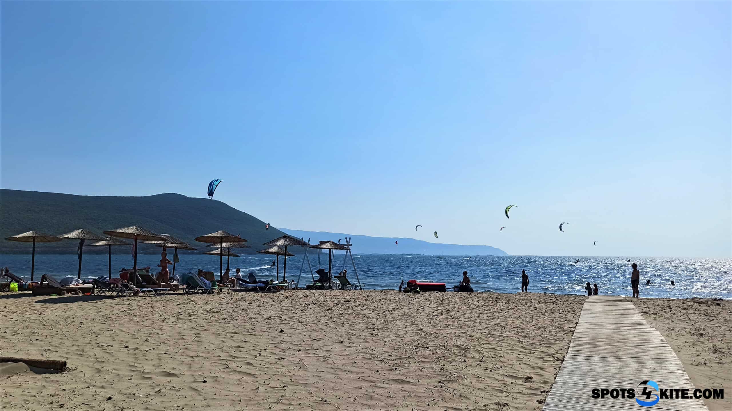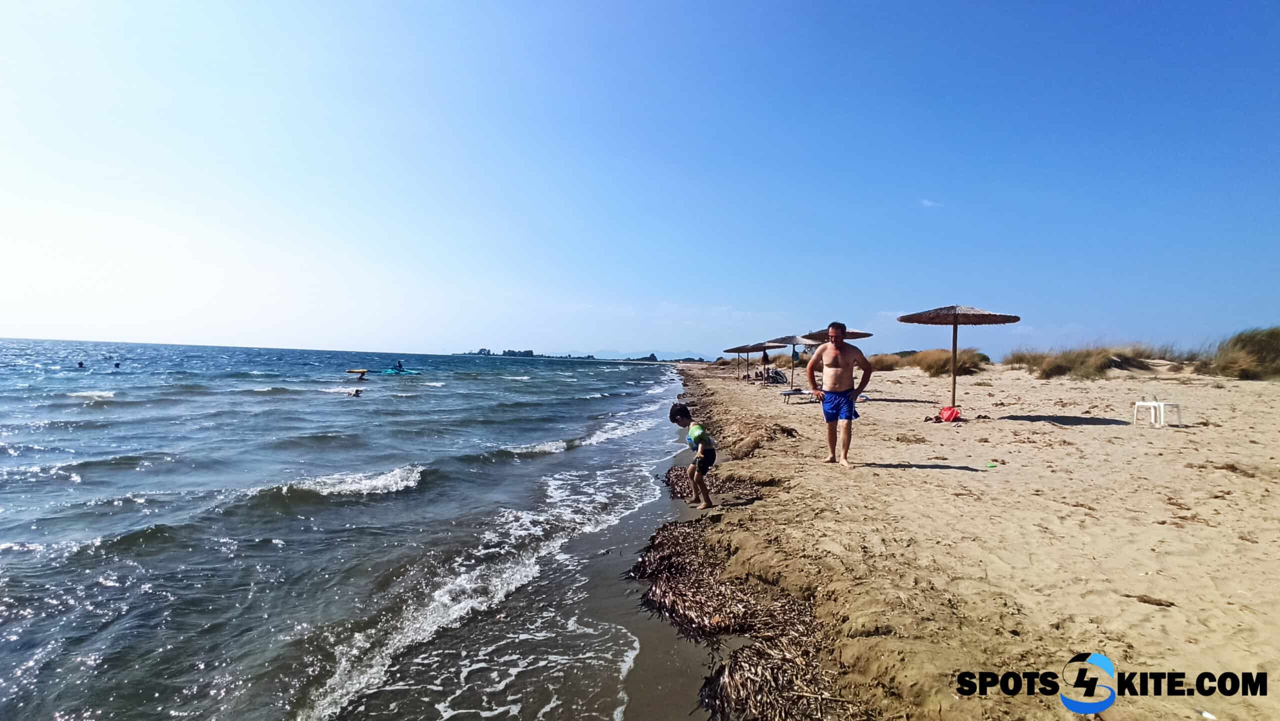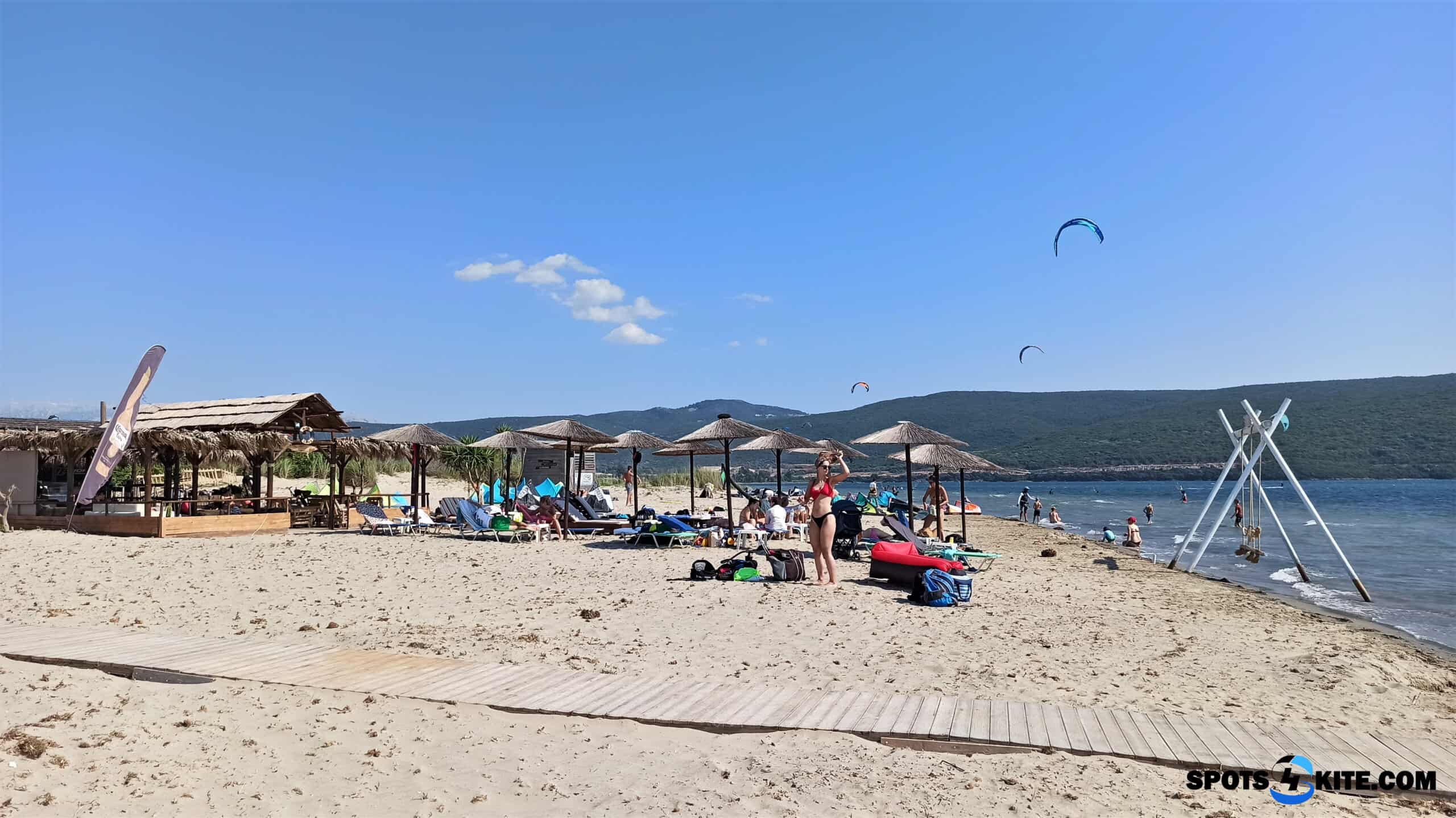 The overall quality of the facilities is rather below average. The outdoor showers are functional, but there must not be more than one running, otherwise, the water flow is too weak. When someone rinses the boards and harnesses at the bar, you can’t rinse off in the showers at the beginning of the car park. There is also a toilet in a wooden shed and flushing is often just with water from a bucket. Parking and sleeping are right next to the road, either on the sand or, if you can grab a spot, on the grass. We paid 8 euros a night for parking (back in June it was only 7). Frappes and drinks at the beach bar have also become more expensive. The beach was slightly clogged with seaweed and the bar lacked carpets for laying and packing kites (they were still there last year).