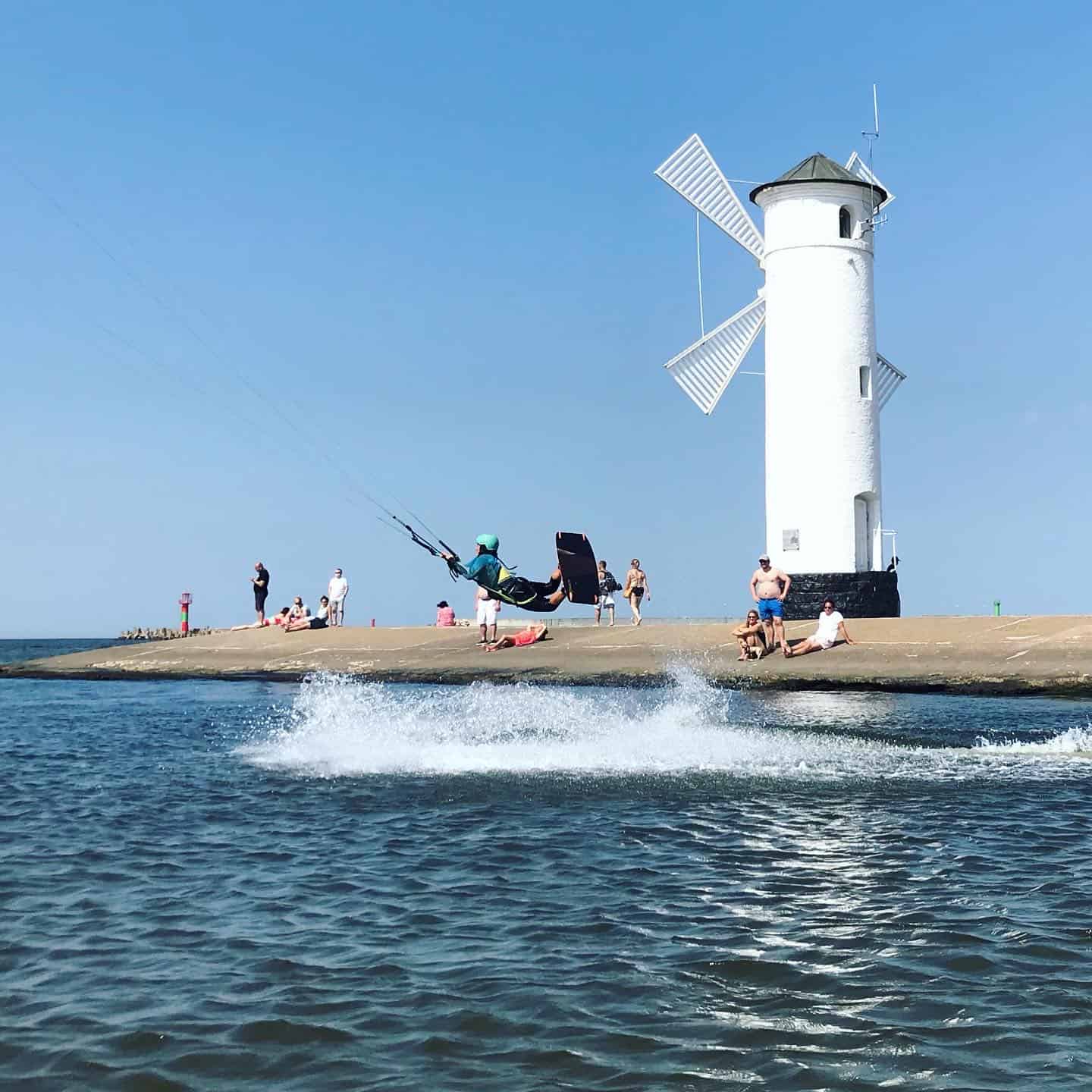 We, however, like flat water, so we got sent on a flat to Świnoujście. Usedom is divided by the border into German and Polish sides. Świnoujście is already on the Polish side. The flat there is created behind a low wall that separates the shallow, bathing beach from the canal where boats pass through to the harbour.