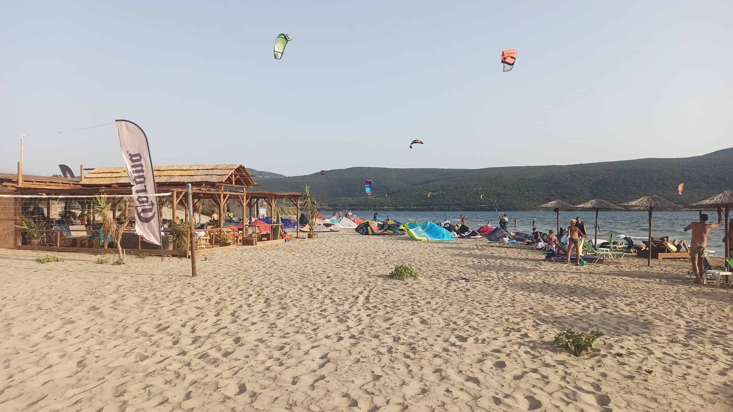 Good spot for beginners. You must pay for staying there (around 7 eur per day) and will get water, quite a bad toilet and access to the beach bar. Otherwise there is nothing. But the village is about 2km far away so you can always go shopping. Wind is present almost every day but it’s usually not strong. Around 12 to 14 knots. If you get stronger wind you can enjoy perfect sessions on flat water on the other side of the beacch.