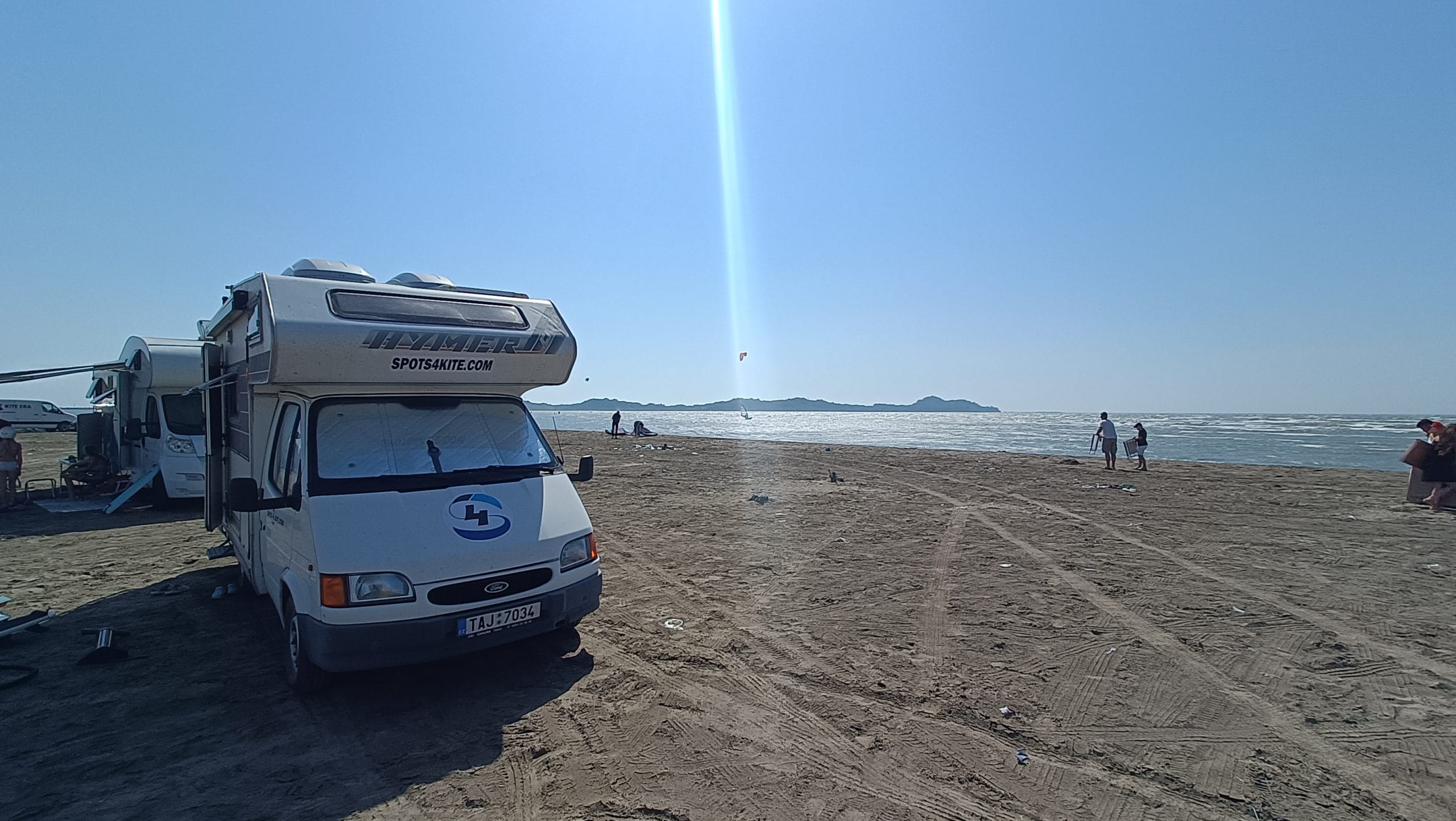 Rinia Sector is a huge sandy beach with several dozen beach bars, umbrellas and large parking lots in front of the access road. You can comfortably drive across the hard sand to the back of the beach, which is popular with kitesurfers in windy weather.