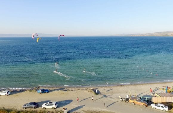 The coastal section of Saros is characterized by shallow waters and small waves, making it an excellent spot for both beginners and advanced kitesurfers. The beach is sandy, providing a comfortable area for launching and landing kites.