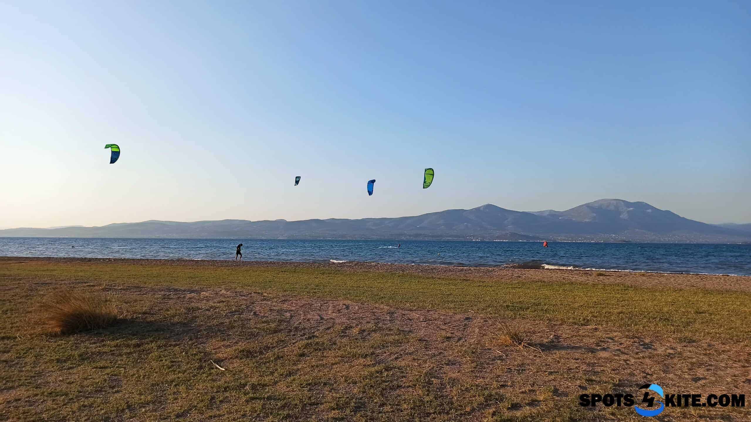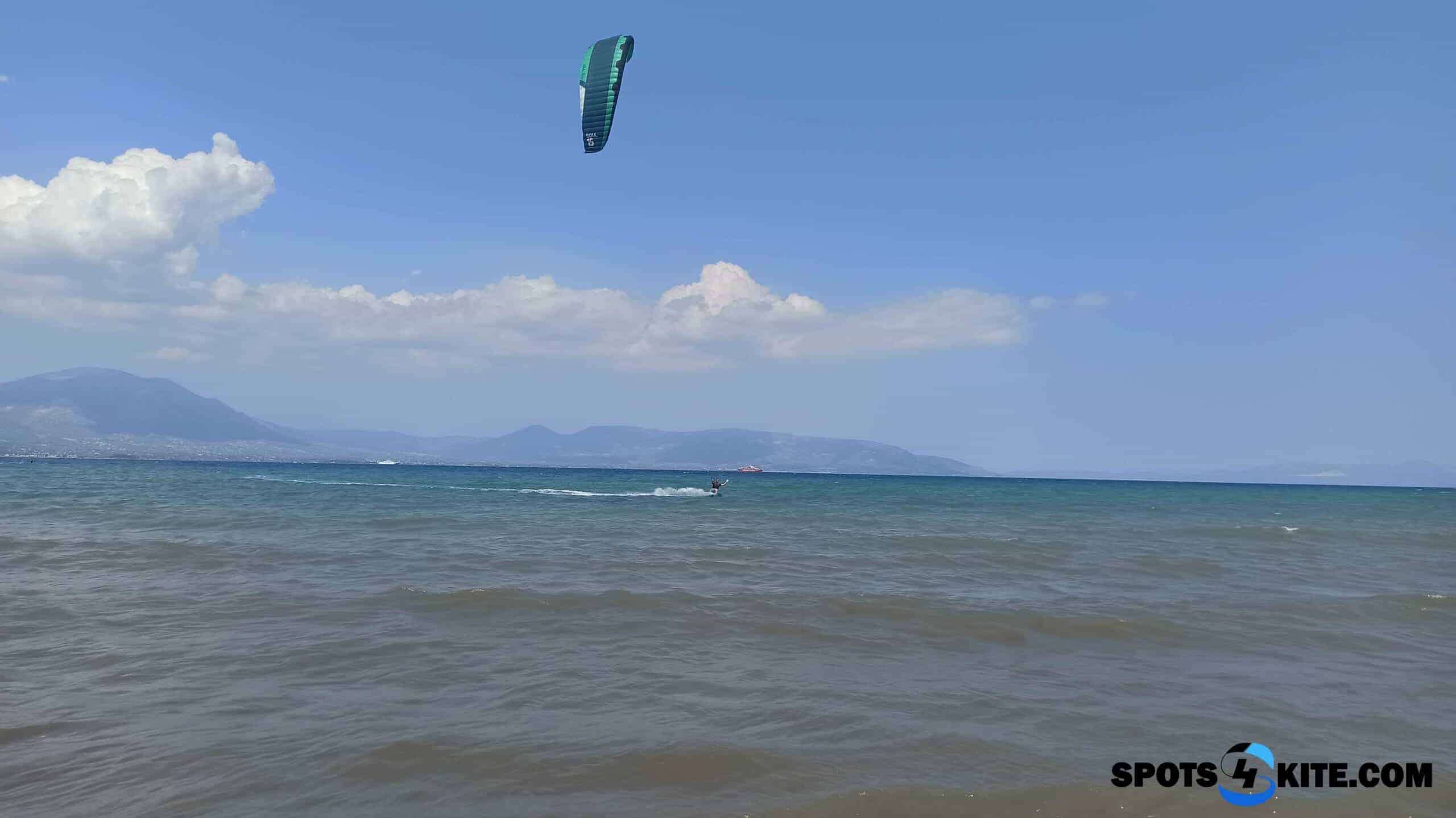Set along the narrow strait opposite Evia island, the spot benefits from a natural wind tunnel effect that enhances the local breeze, especially during the summer months when thermal winds kick in reliably and consistently. The ideal wind direction is from the east to southeast. Note that strong northern Meltemi winds, while common in Greece, tend to overpower the thermal effect here and make kiting impossible on those days.