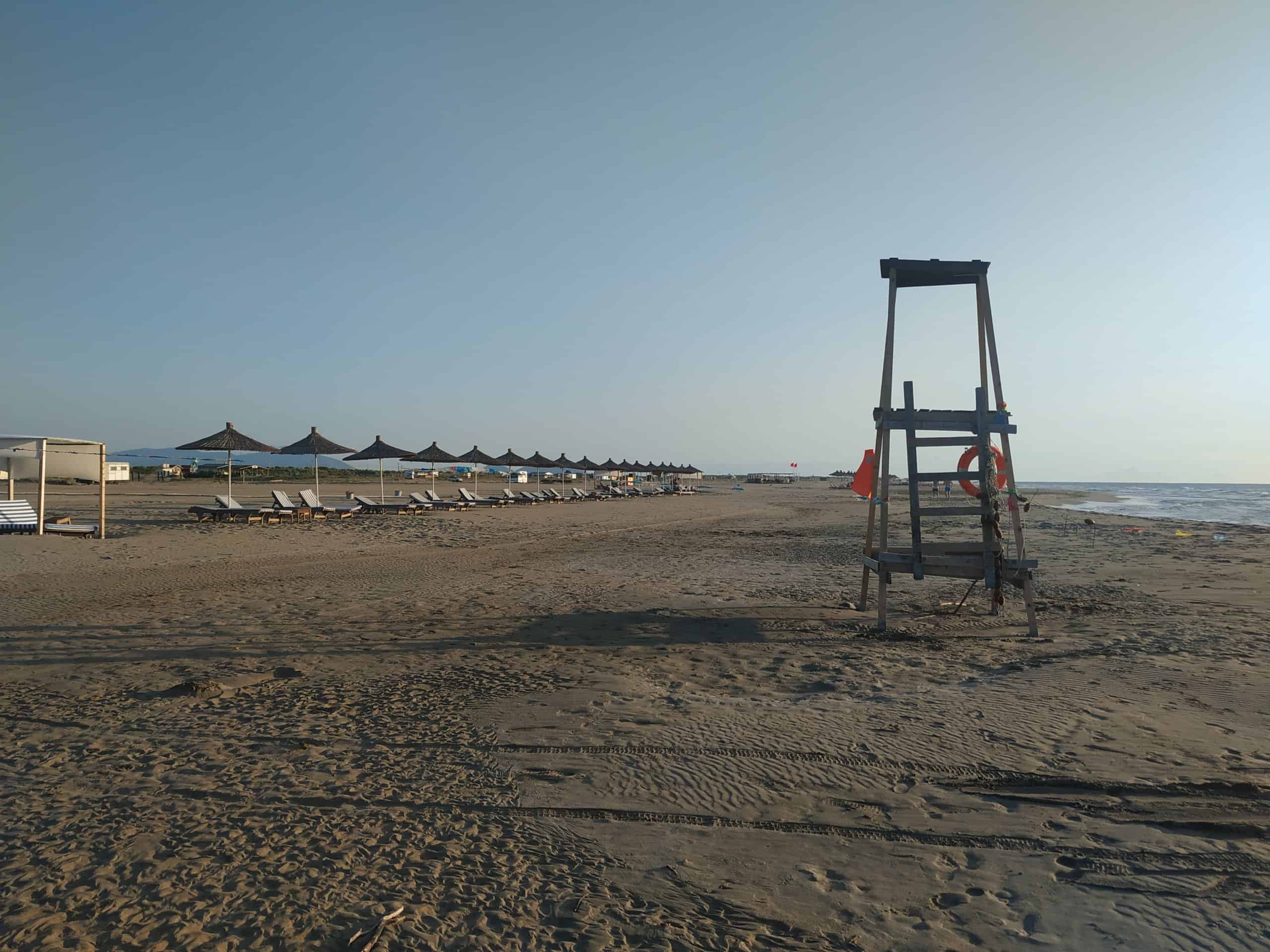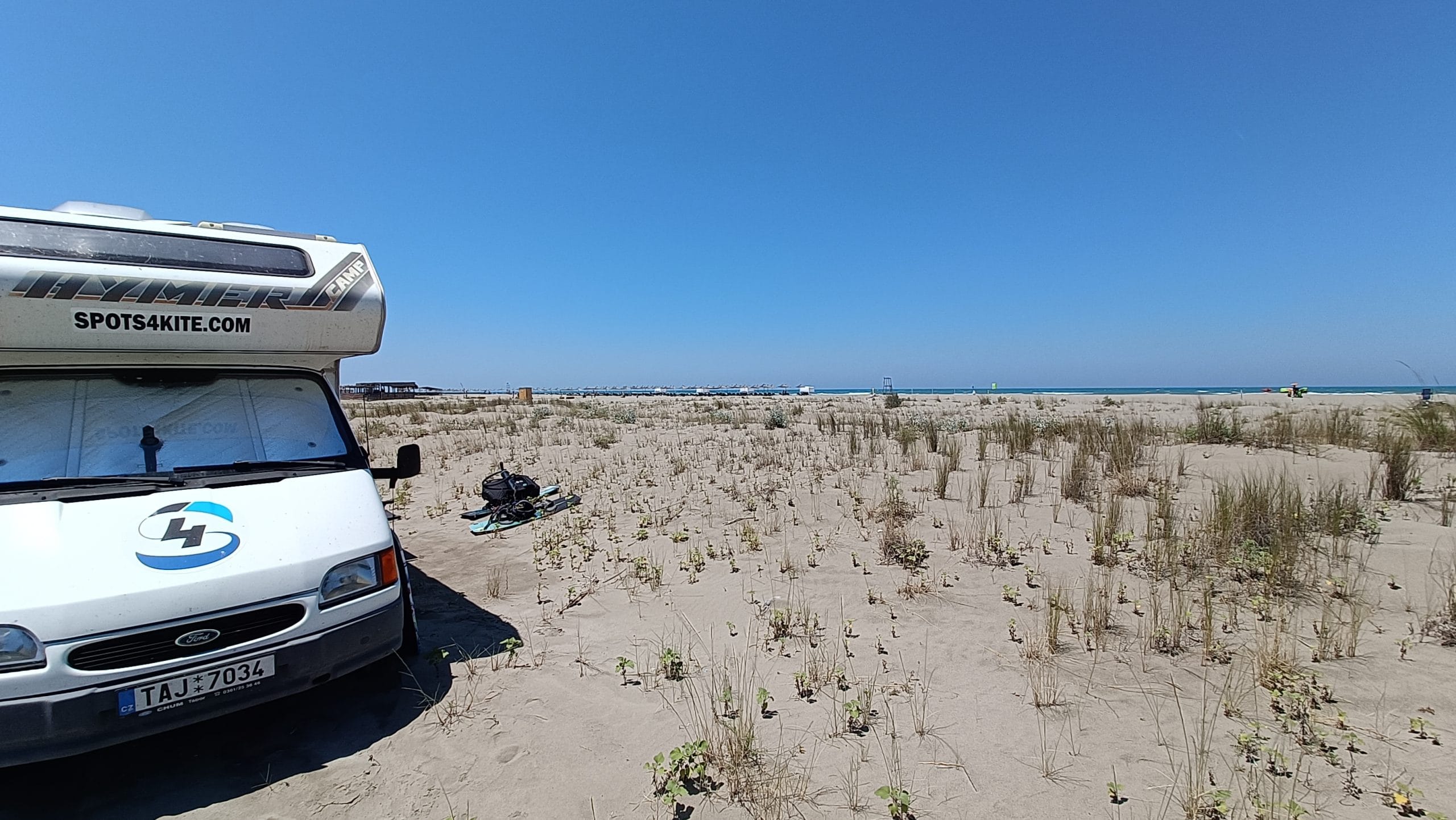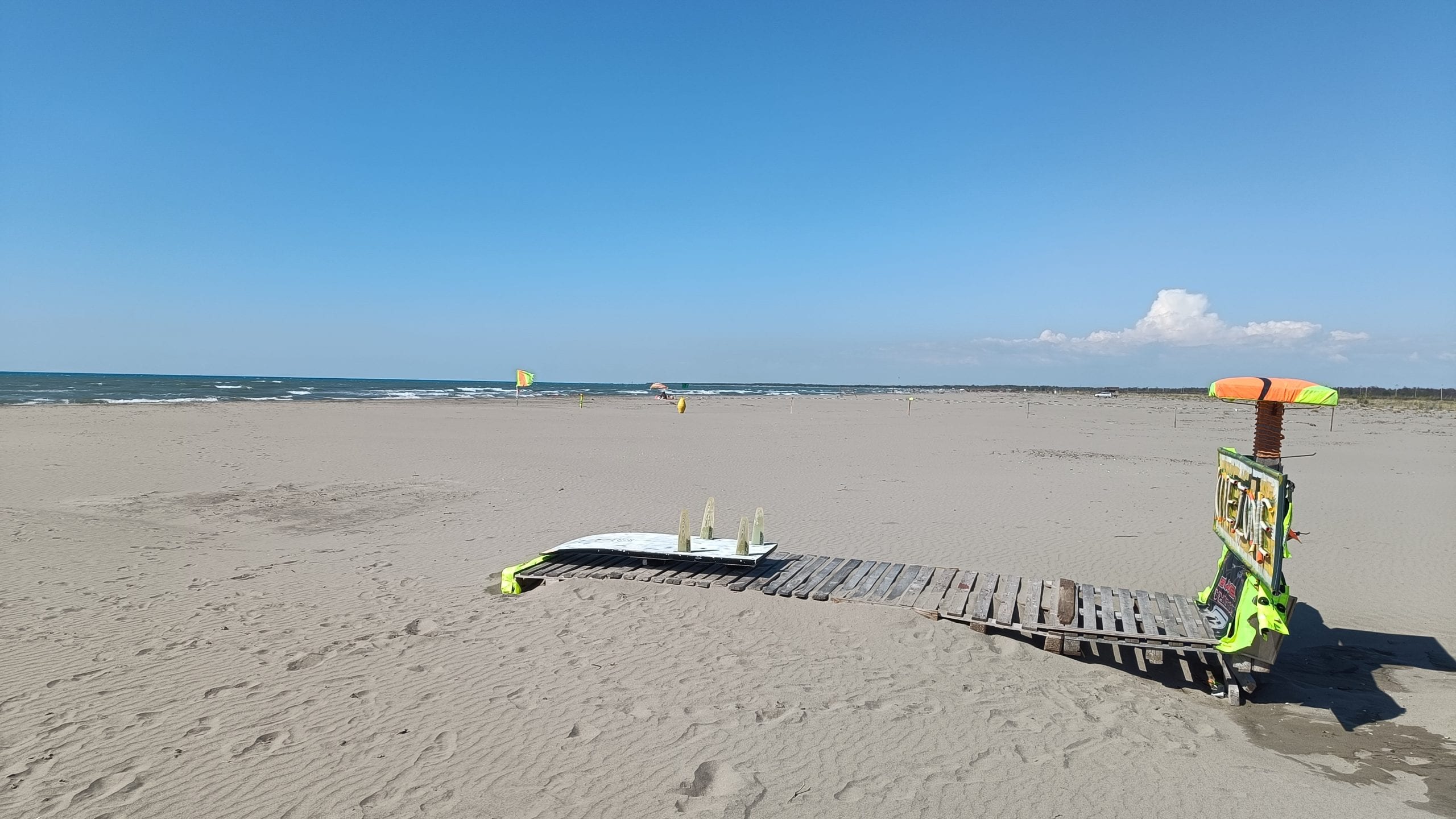 The beach is several hundred meters wide, sandy, with a gentle entrance into the water. There is a designated kitesurfing zone where it is possible to start and ride. The rule here is also not to ride in areas with sunshades and avoid areas with swimmers.