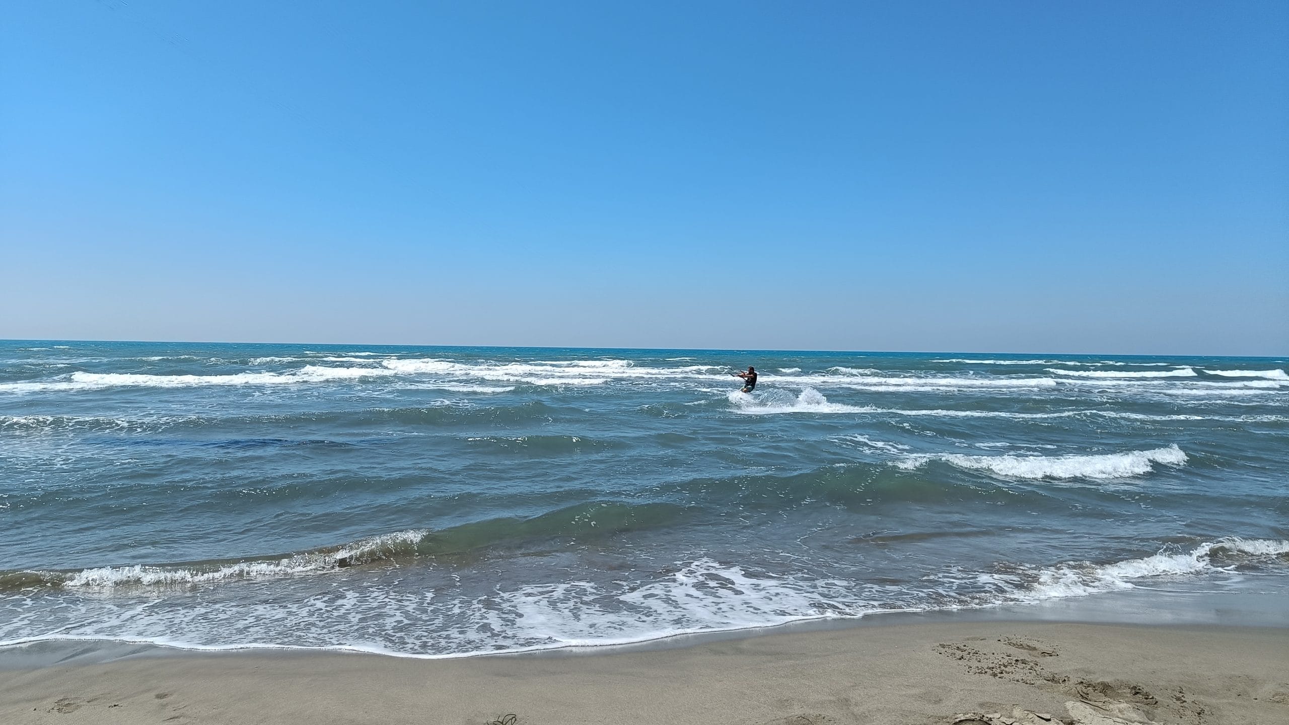 The wind suitable for kitesurfing here blows from several directions, most often westerly winds that blow onshore or side-onshore. The water entry is gradual, but the coastline meanders, the sandy bottom rises in places, and strong waves form near the shore. The waves come one after another, constantly changing direction, making it very difficult to navigate through them and reach calmer water.